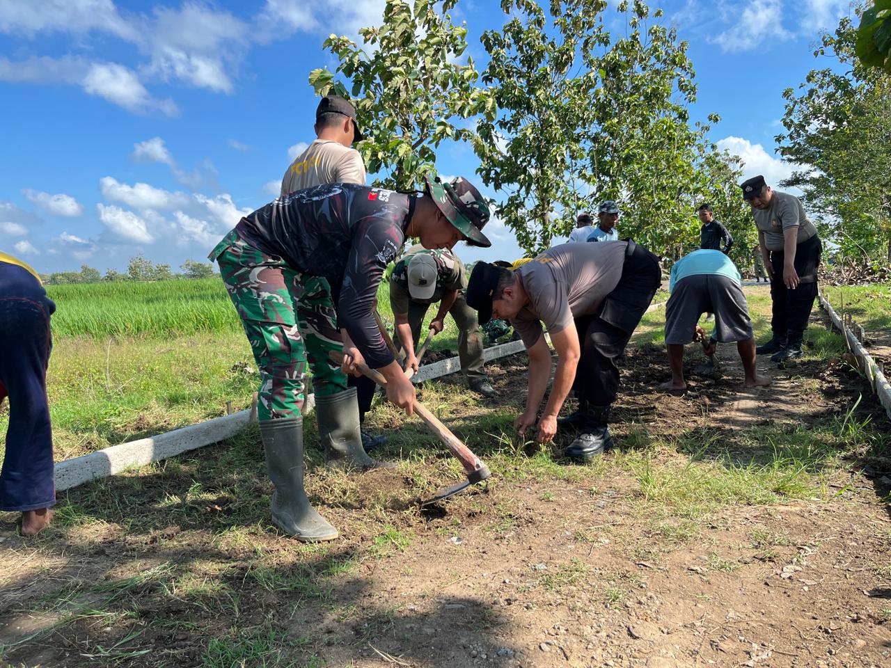 Pada pembangunan jalan beton penghubung Terik Mulyo–Puro, Satgas TMMD bersama warga terlihat bergotong royong meratakan tanah dan membersihkan sampah sebelum pengecoran dilakukan.
